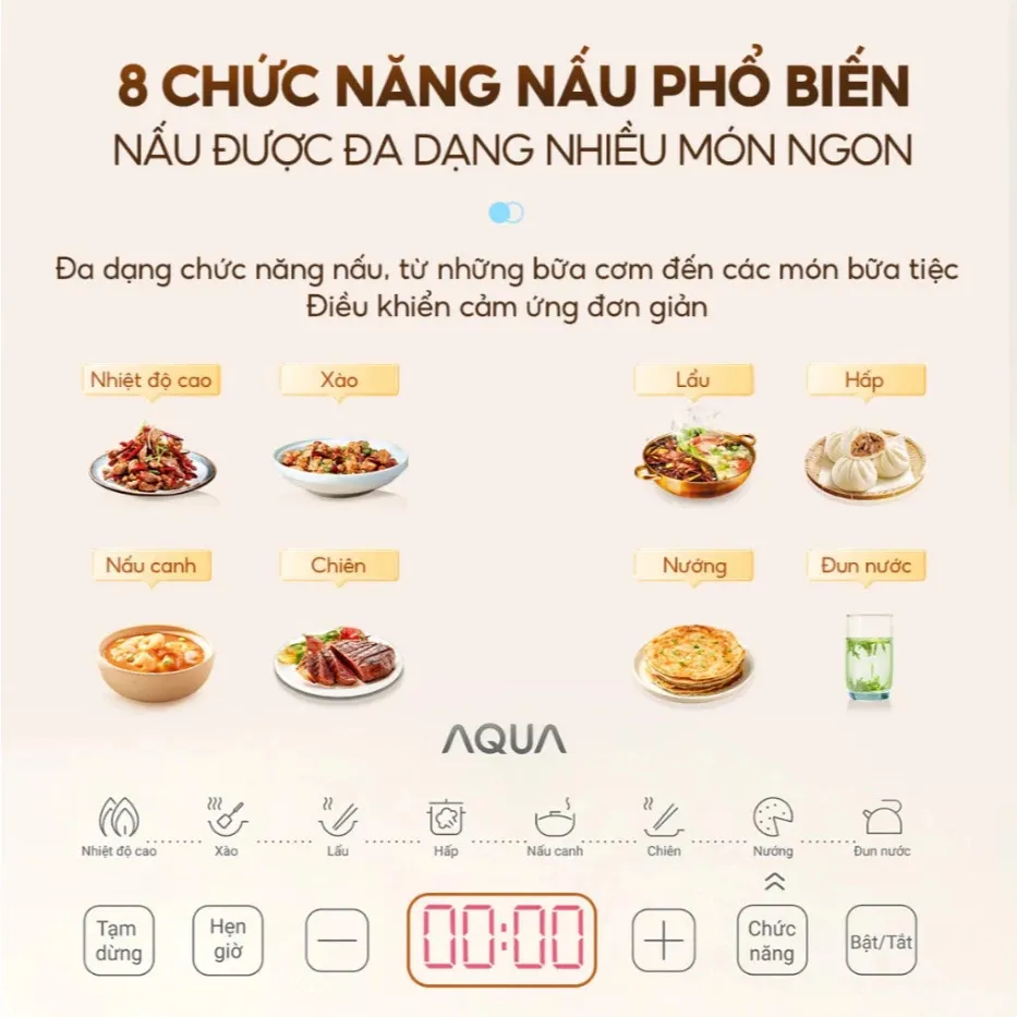 Trang bị 8 chế độ nấu tự động như đun nước, nấu canh, chiên, xào, hấp… và 22 mức điều chỉnh nhiệt, bạn dễ dàng điều chỉnh theo từng món ăn và nhu cầu sử dụng.