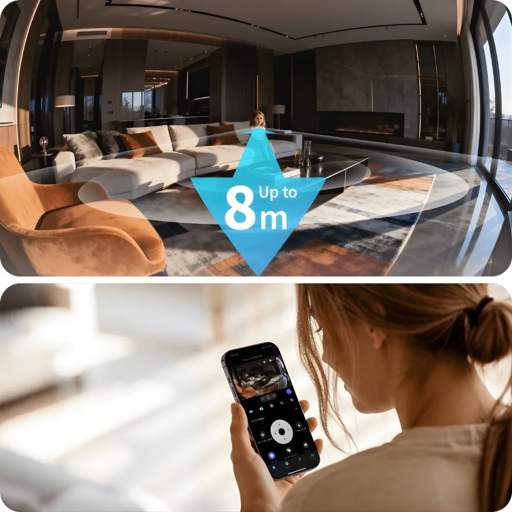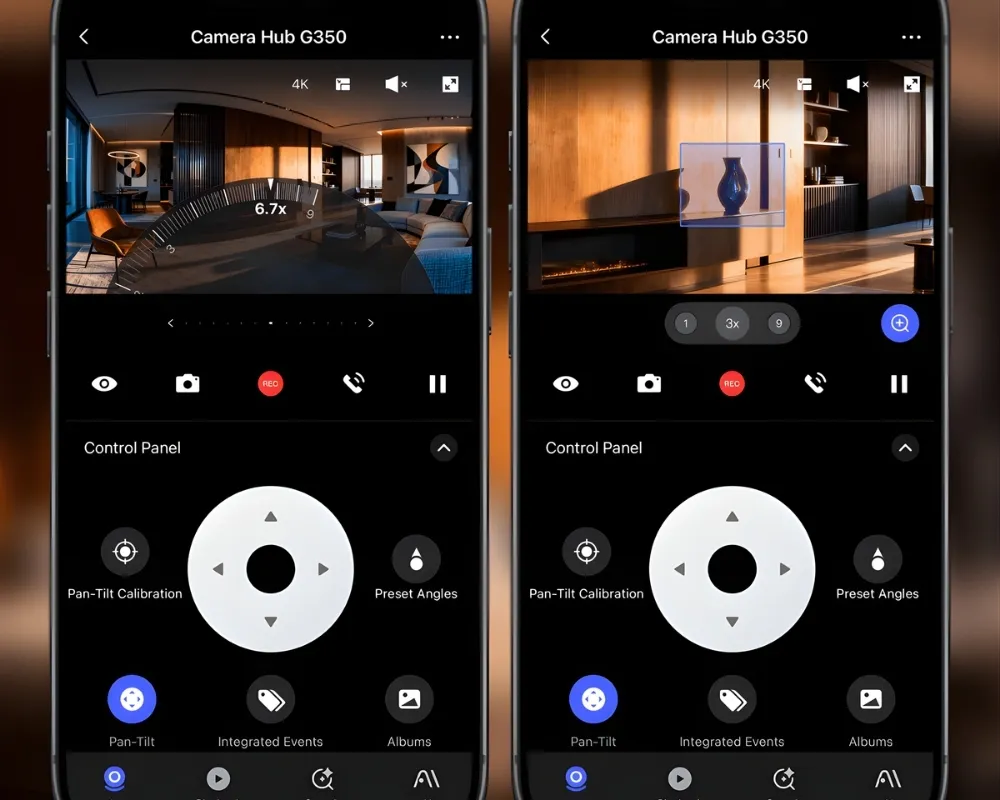 Aqara G350 nổi bật với hệ thống camera kép (Dual-Lens) gồm ống kính góc rộng 8MP 4K và ống kính tele 4MP 2.5K, cho phép zoom lai 9x mà vẫn giữ độ nét cao. Kết hợp với khả năng xoay ngang 360° và xoay dọc 45°, G350 bao quát gần như toàn bộ không gian, giảm thiểu đáng kể điểm mù so với các camera cố định.