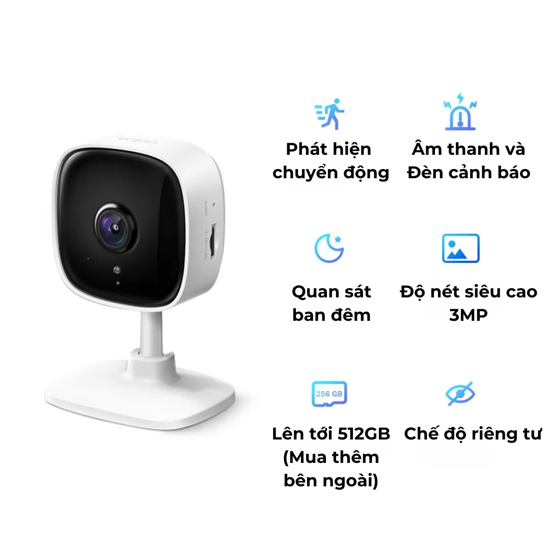 - Lưu trữ: Hỗ trợ thẻ nhớ microSD lên đến 256GB hoặc lưu trữ đám mây với Tapo Care