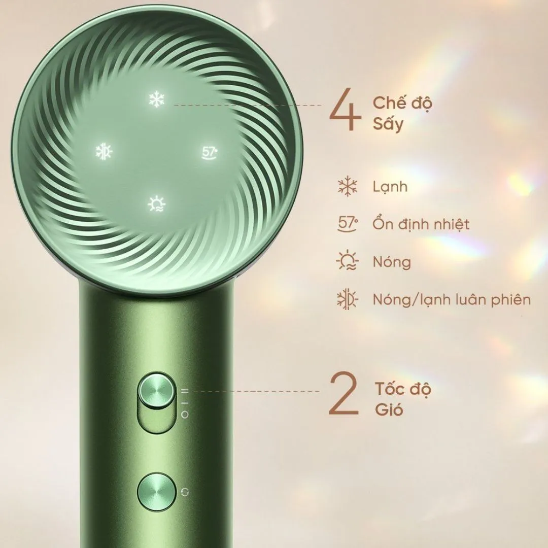 Máy sấy tóc Dreame Hair Glory Master được trang bị động cơ không chổi than tốc độ cao 110.000 vòng/phút, tạo luồng khí mạnh mẽ với tốc độ thổi 70m/s, giúp làm khô tóc nhanh chóng chỉ trong 2-3 phút. Sản phẩm cung cấp 2 tốc độ gió và 4 chế độ nhiệt (lạnh, nhiệt không đổi 57°C, nóng, kết hợp nóng/lạnh), đáp ứng đa dạng nhu cầu sấy và tạo kiểu. Công nghệ 300 triệu ion âm giúp giảm tĩnh điện, bảo vệ tóc khỏi hư tổn và giữ cho tóc luôn mềm mượt, bóng khỏe. Máy đi kèm 3 đầu sấy chuyên dụng: đầu sấy khuếch tán cho tóc xoăn, đầu sấy tạo kiểu và đầu phun tinh chất, giúp bạn dễ dàng tạo kiểu tóc mong muốn. Thiết kế nhỏ gọn với trọng lượng chỉ 355g, Dreame Hair Glory Master thuận tiện cho việc sử dụng và mang theo khi di chuyển.