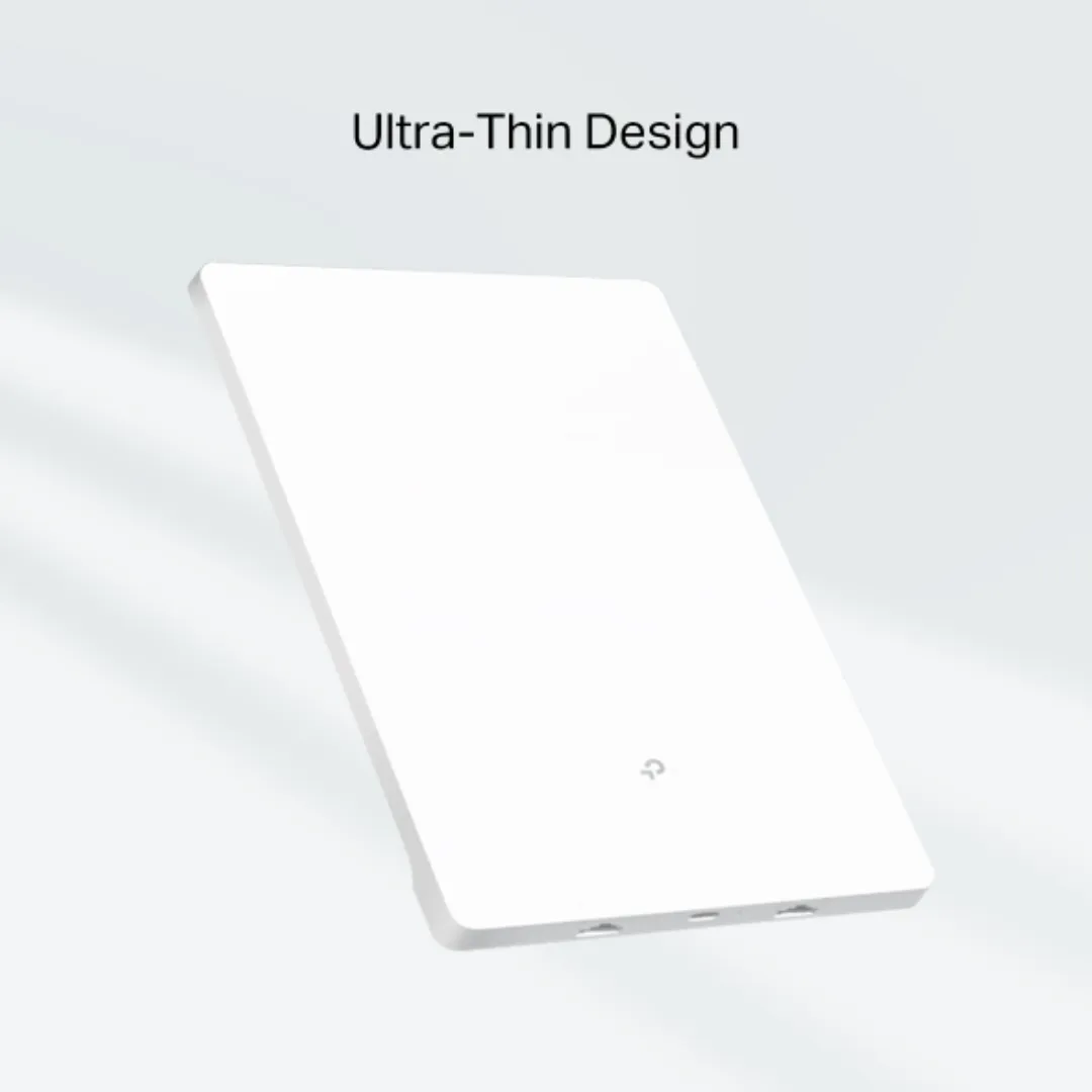 Router WiFi 6 TP-Link AX3000 Archer Air R5 sở hữu kích thước nhỏ gọn 210×148×8 mm, mỏng hơn cả ổ cắm trên tường, mang đến thiết kế siêu mỏng và tinh tế. Với lớp vỏ màu trắng tinh khiết, các đường nét tối giản và góc bo tròn, Archer Air R5 dễ dàng hòa hợp với nội thất hiện đại. Nút LED và WPS 2 trong 1 ở mặt trước cùng cổng nguồn Type-C ở phía dưới không chỉ tạo nên vẻ ngoài trang nhã mà còn làm cho thiết bị thêm phần tiện dụng.