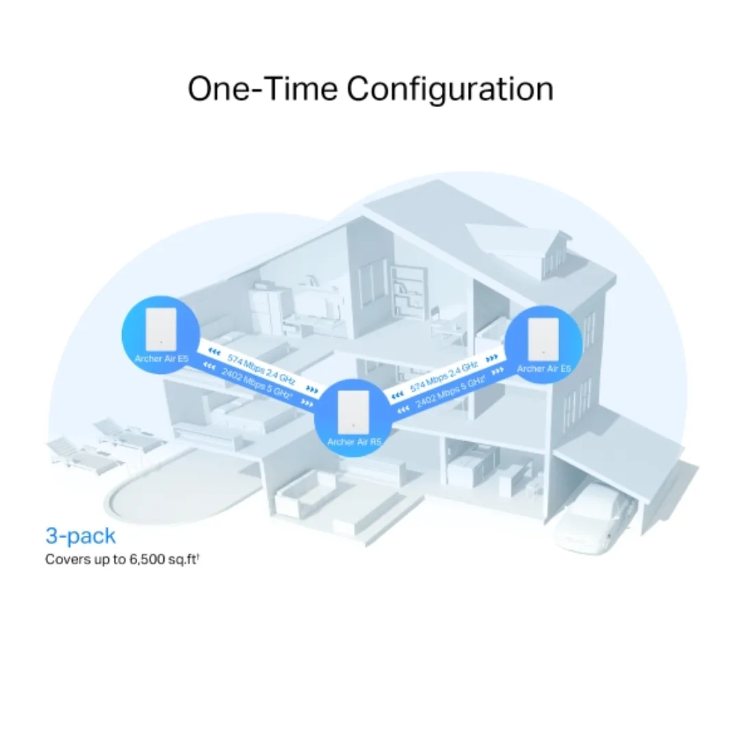 Để thiết lập mạng Mesh toàn ngôi nhà với Router WiFi 6 TP-Link AX3000 Archer Air R5 (3 pack), chỉ cần cấu hình router một lần duy nhất. Hai bộ mở rộng sóng còn lại sẽ tự động đồng bộ hóa, giúp việc thiết lập trở nên dễ dàng và nhanh chóng mà không cần cấu hình từng nút riêng lẻ. Đồng thời, ăng-ten thông minh của Router WiFi 6 TP-Link AX3000 Archer Air R5 tự động điều chỉnh để tối ưu hóa tín hiệu, đảm bảo sóng Wi-Fi ổn định và phủ sóng toàn diện, ngay cả trong những không gian phức tạp như nhà duplex.