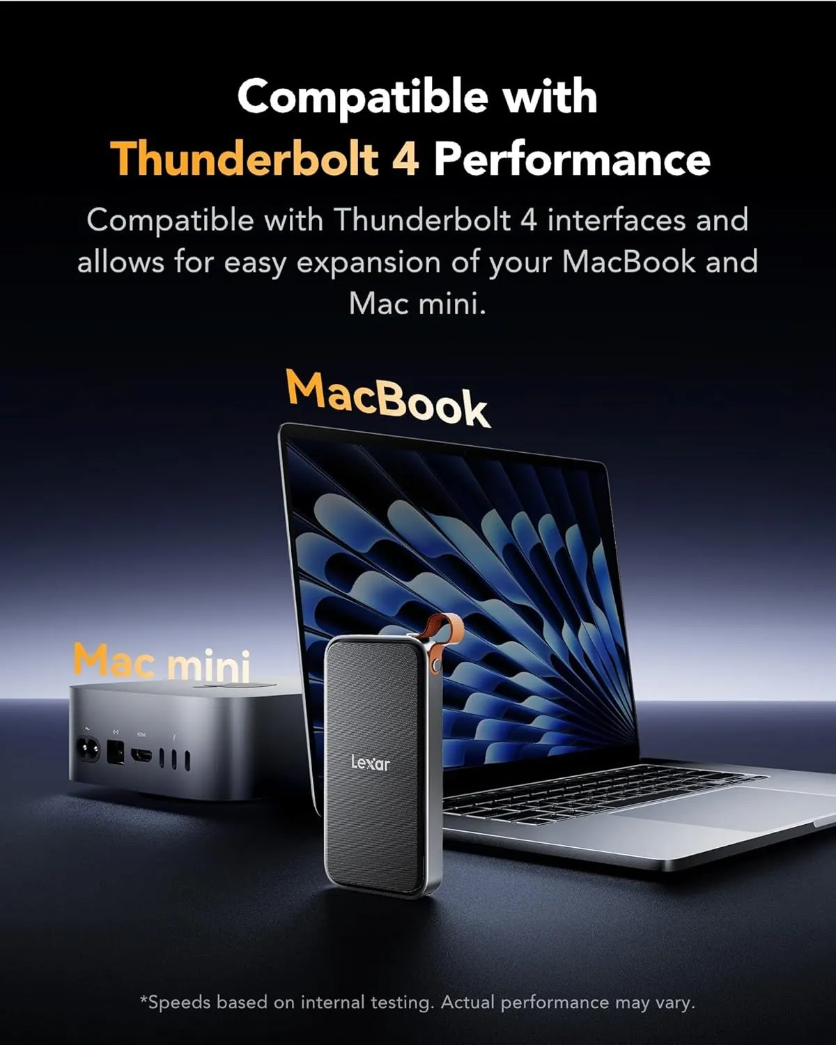 Sự linh hoạt trong kết nối là một trong những ưu điểm vượt trội mà Box SSD Lexar E750 mang lại. Sản phẩm này không chỉ hỗ trợ mạnh mẽ các giao thức hiện đại nhất như USB4 và Thunderbolt 4, biến nó thành lựa chọn lý tưởng để mở rộng bộ nhớ cho các thiết bị cao cấp như các dòng MacBook mới nhất, Mac Studio, Mac mini, hay các laptop workstation mạnh mẽ sử dụng Windows.