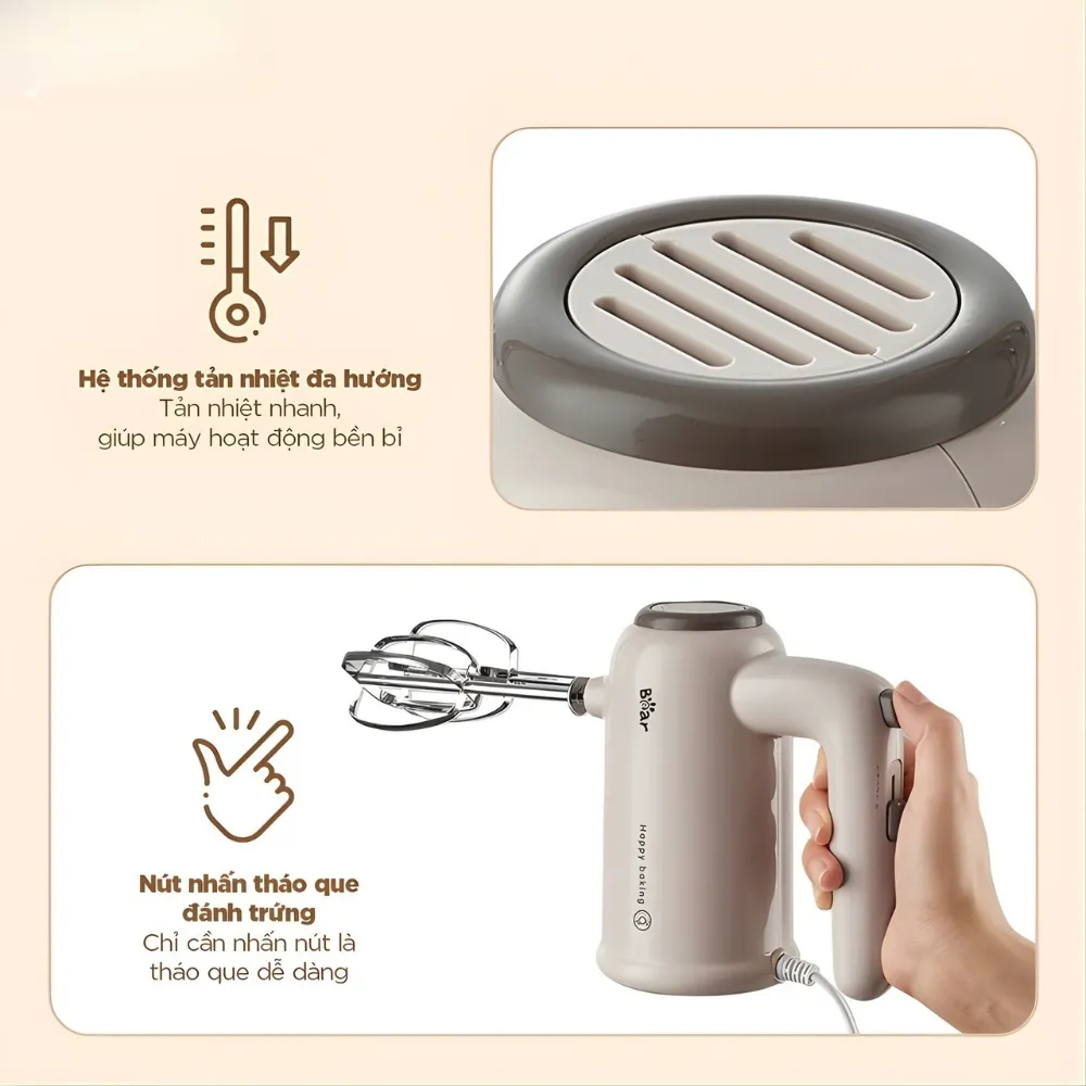 Máy đánh trứng Bear HM-5H01J29 là lựa chọn tối ưu dành cho các gia đình và người yêu thích làm bánh tại nhà, giúp nâng tầm trải nghiệm bếp núc với hiệu năng mạnh mẽ, độ bền cao và thao tác dễ dàng. Tham khảo thêm các sản phẩm gia dụng Bear để bổ sung bộ đồ dùng tiện ích cho căn bếp của bạn.