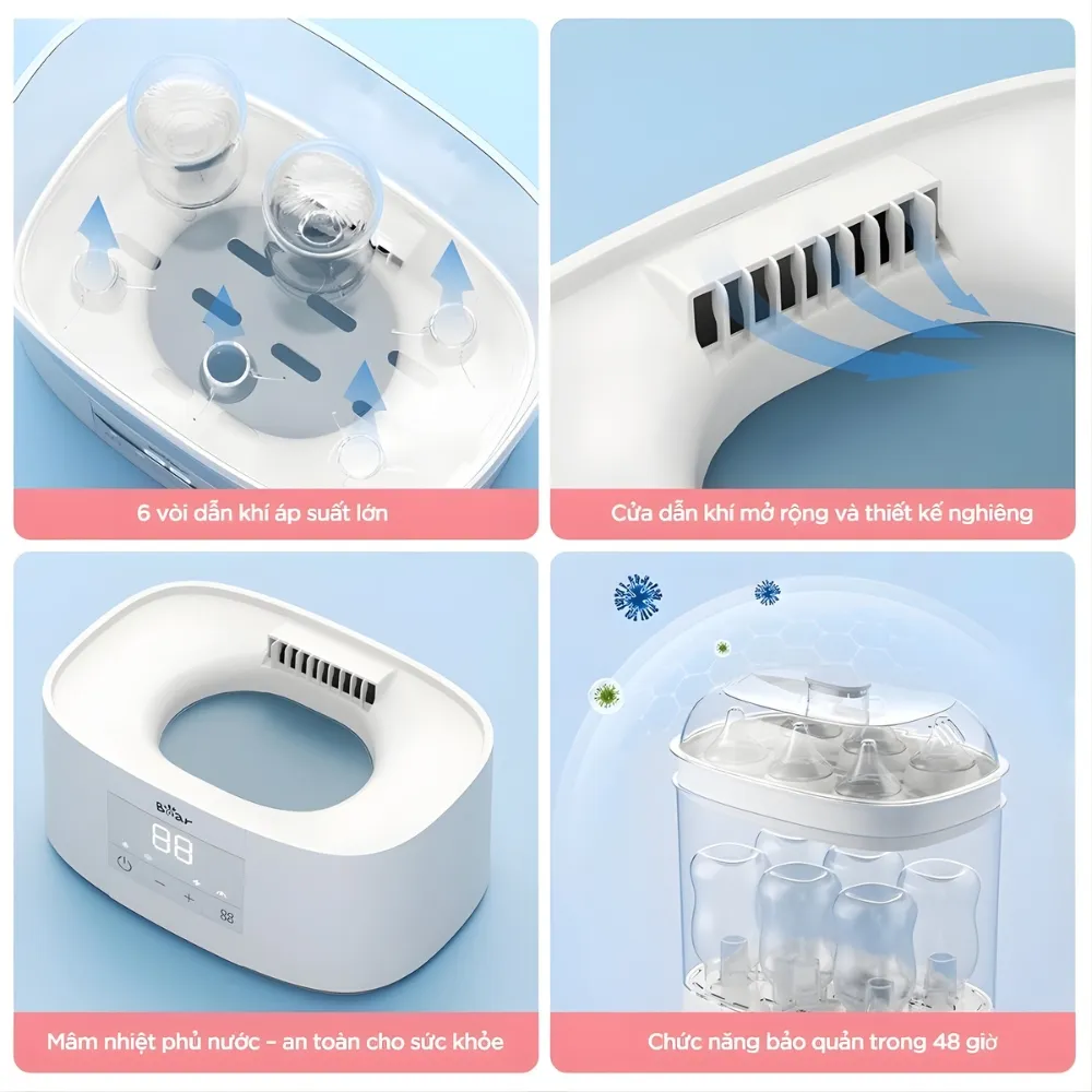 Bảo Quản Vô Trùng Lên Đến 48 Giờ: Sau khi hoàn tất chu trình tiệt trùng và sấy khô, khoang máy kín sẽ duy trì một môi trường vô trùng, ngăn không cho vi khuẩn từ môi trường bên ngoài xâm nhập. Bình sữa và các vật dụng bên trong được bảo quản an toàn và luôn trong trạng thái sẵn sàng để sử dụng ngay lập tức trong vòng 48 giờ, với chu trình sấy lại tự động mỗi 2 giờ.