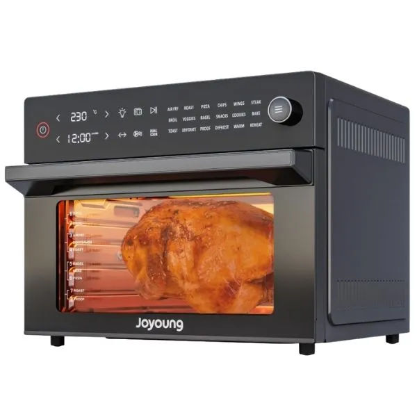 Joyoung KX30-V583 nổi bật với thiết kế sang trọng, tích hợp 2 trong 1 giữa lò nướng truyền thống và nồi chiên không dầu, giúp món ăn chín đều, giòn ngon, ít dầu mỡ mà vẫn giữ được độ ẩm và hương vị tự nhiên.