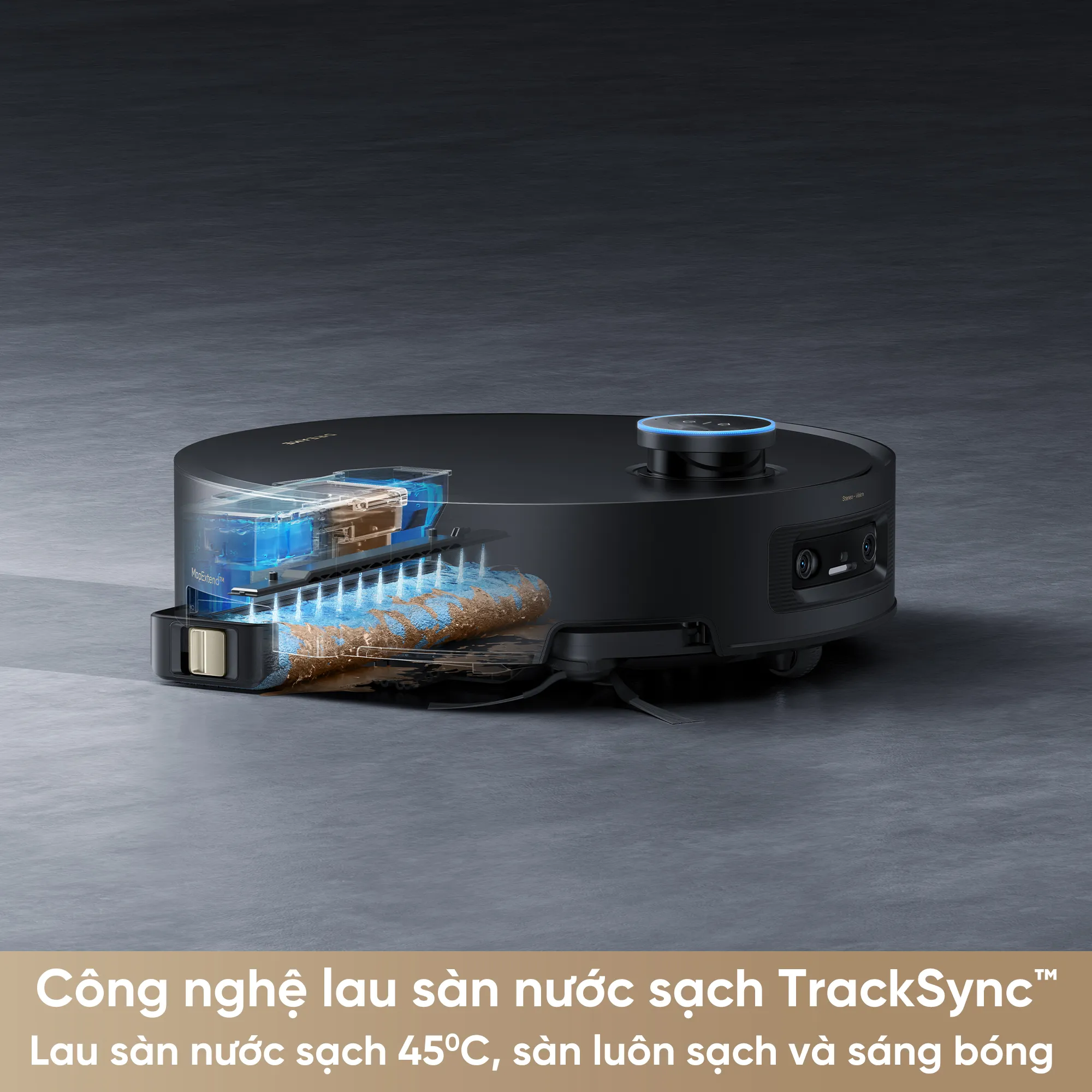 Robot hút bụi lau nhà Dreame Aqua 10 Pro được trang bị công nghệ lau sàn nước sạch TrackSync™ kết hợp với nhiệt độ nước nóng 45°C, mang lại hiệu quả vượt trội trong việc làm sạch và khử khuẩn.