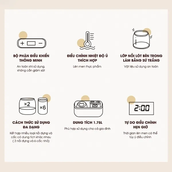 - 4 chế độ lên men đa năng: Làm sữa chua, rượu gạo, natto, dưa muối
