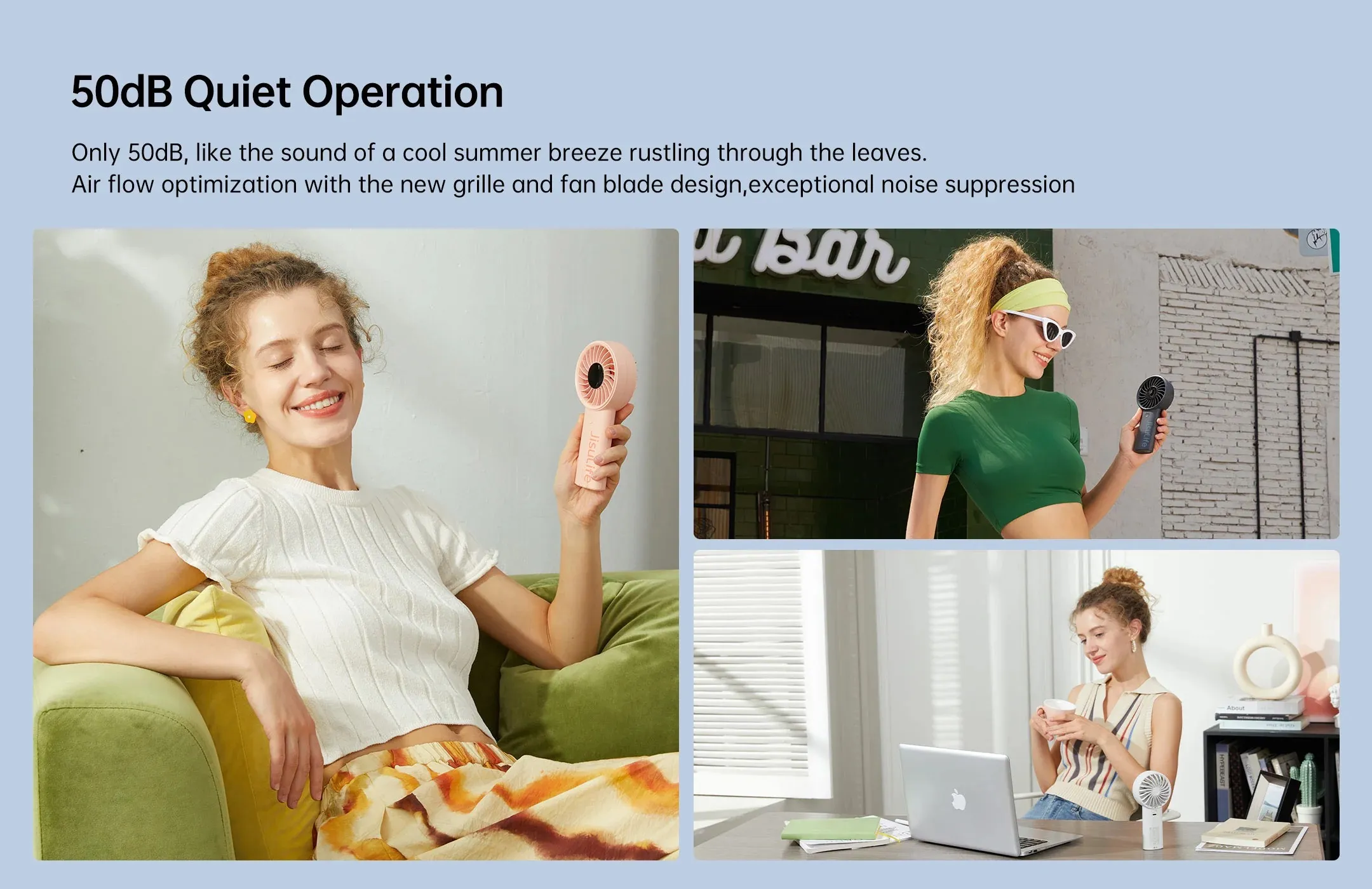 JISULIFE Handheld Fan Life4 có sẵn trong ba màu sắc thời trang: Trắng, Xám Đậm và Hồng. Chọn màu sắc phù hợp với phong cách của bạn và tạo dấu ấn trong khi vẫn giữ được sự mát mẻ.