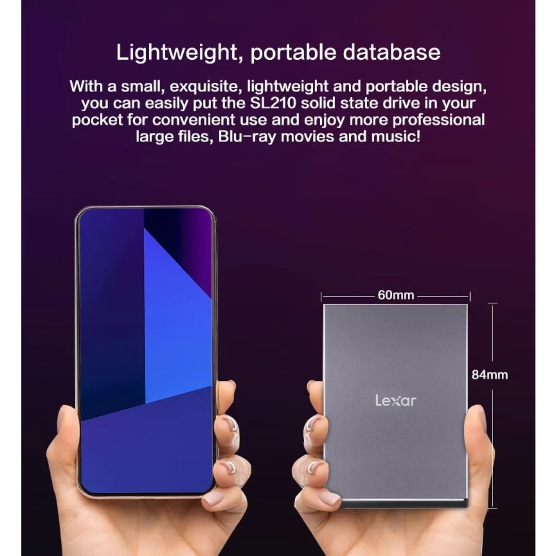 Ổ cứng di động Lexar SL210 Portable SSD là ổ cứng thể rắn hiện đại được thiết kế cho các cá nhân và chuyên gia, những người yêu cầu lưu trữ nhanh và đáng tin cậy khi di chuyển. Có 3 loại với các kích thước dung lượng khác nhau như Ổ cứng di động Lexar SL210 Portable SSD 500GB, 1TB và 2TB. Với thiết kế nhỏ gọn và nhẹ, ổ SSD di động này mang đến sự cân bằng hoàn hảo giữa sự tiện lợi và hiệu suất.