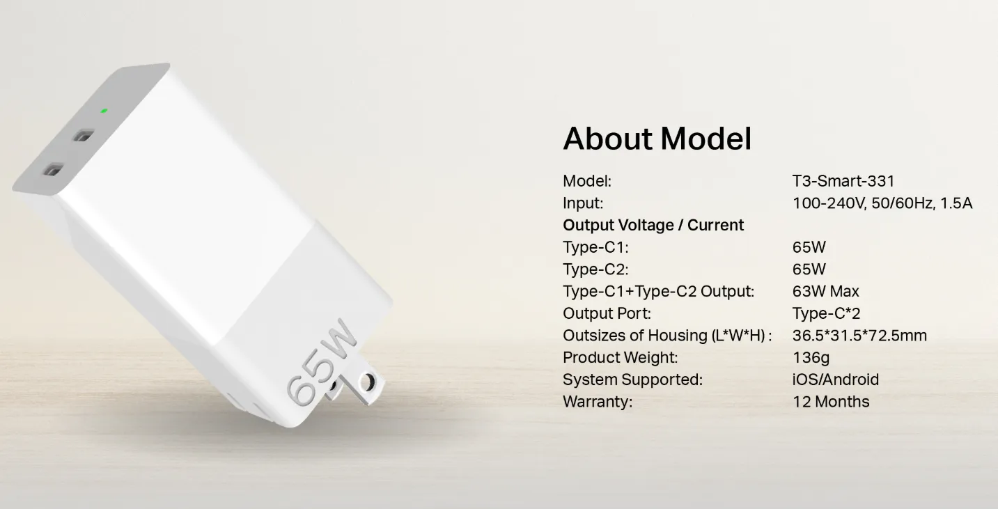 - Bạn ghét phải chờ đợi? T3 Smart FC1 chính là “phép màu” biến nỗi bực bội thành sự hài lòng tức thì. Với công suất lên đến 65W và khả năng nạp 50% pin chỉ trong vòng 30 phút cho smartphone, bạn sẽ không bao giờ lỡ mất bất kỳ cuộc gọi quan trọng hay khoảnh khắc đáng giá nào vì hết pin nữa. Cuộc sống năng động của bạn sẽ không còn bị gián đoạn!