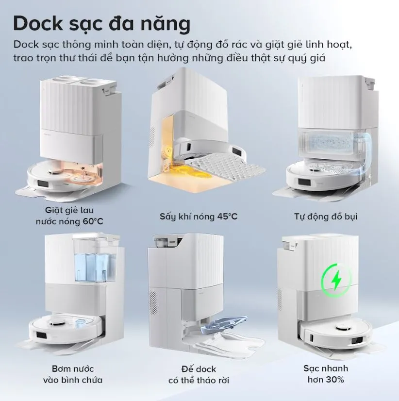 Dock sạc đa năng – Giặt nước nóng, sấy giẻ, đổ bụi, cấp nước