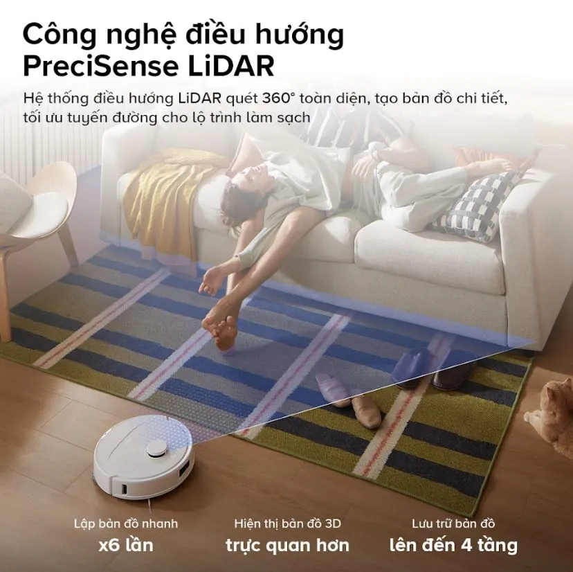 Không chỉ mạnh mẽ, Qrevo C Pro còn cực kỳ thông minh trong cách di chuyển. Nhờ tích hợp công nghệ định vị laser PreciSense LiDAR tiên tiến, robot có khả năng quét và lập bản đồ không gian 360 độ trong thời gian thực, xác định chính xác vị trí đồ vật, tường và khu vực đã làm sạch.