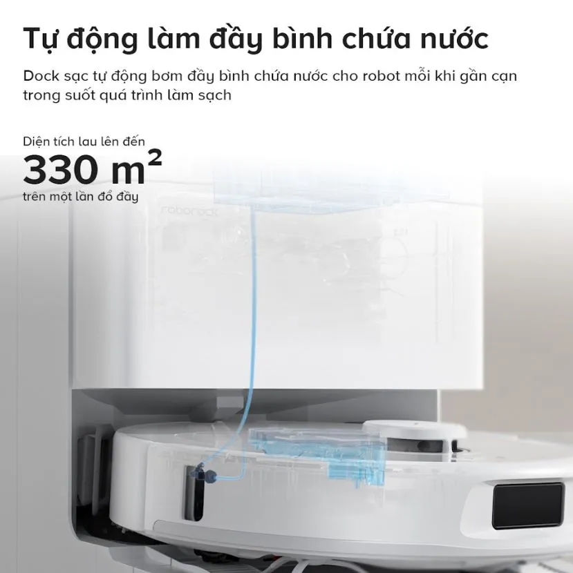 Không cần đổ nước thủ công, dock sẽ tự động bơm đầy bình chứa nước sạch giúp máy có thể lau liên tục trên diện tích lên tới 330m². Bạn chỉ cần đổ nước một lần là có thể yên tâm cả tuần. Hệ thống thông minh cũng sẽ cảnh báo khi sắp hết nước hoặc đầy bình nước bẩn.