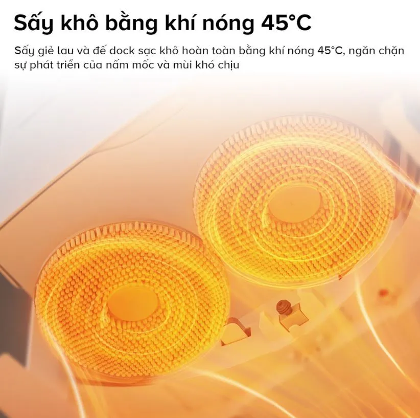 Ngay sau khi giặt xong, giẻ lau sẽ được sấy khô bằng luồng khí ấm 45 độ, ngăn chặn ẩm mốc và vi khuẩn phát triển. Điều này đặc biệt hữu ích trong môi trường ẩm ướt, giúp duy trì độ bền của phụ kiện và không gây mùi trong nhà.