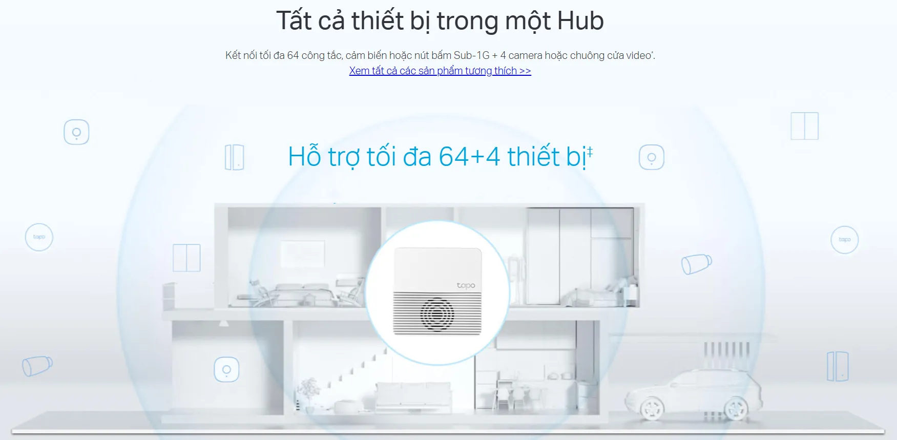 Khả năng mở rộng của Bộ điều khiển thông minh Tapo Hub H200 là một điểm cộng lớn. Thiết bị này có thể kết nối và điều khiển đồng thời lên đến 64 thiết bị thông minh của hệ sinh thái Tapo. Điều này bao gồm các loại cảm biến (như cảm biến cửa/cửa sổ Tapo T110, cảm biến chuyển động Tapo T100), công tắc thông minh, nút nhấn thông minh (Tapo S200B/S200D) và nhiều thiết bị khác. Với khả năng hỗ trợ số lượng lớn thiết bị, Tapo Hub H200 dễ dàng đáp ứng nhu cầu mở rộng hệ thống nhà thông minh của bạn theo thời gian, dù là căn hộ nhỏ hay ngôi nhà lớn.