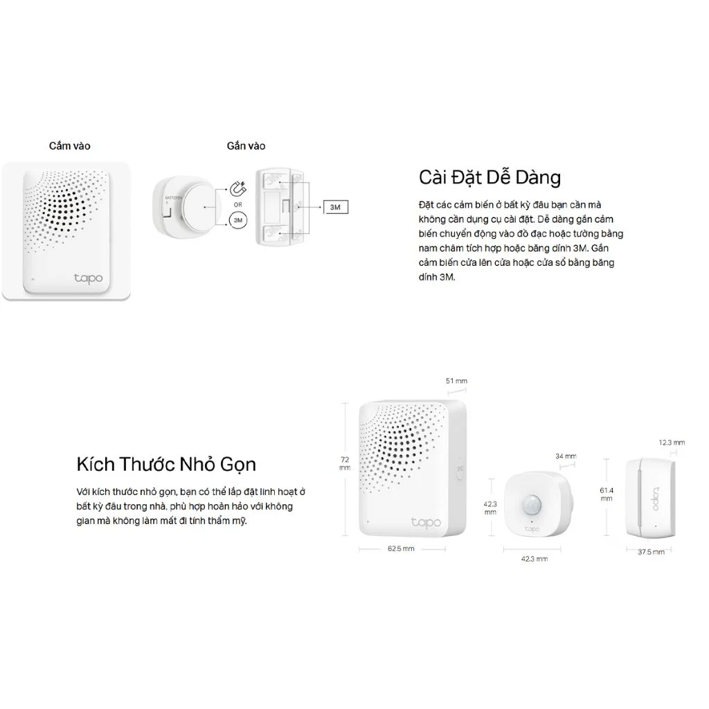 - Cài đặt không cần dụng cụ: Các cảm biến trong bộ kit được thiết kế để lắp đặt nhanh chóng và không phức tạp. Cảm biến cửa thông minh Tapo T110 và Cảm biến chuyển động thông minh Tapo T100 có thể được gắn vào đồ đạc hoặc tường chỉ bằng nam châm tích hợp (đối với Tapo T100) hoặc băng dính 3M (đối với cả hai), loại bỏ hoàn toàn nhu cầu khoan đục hay đi dây điện rườm rà.