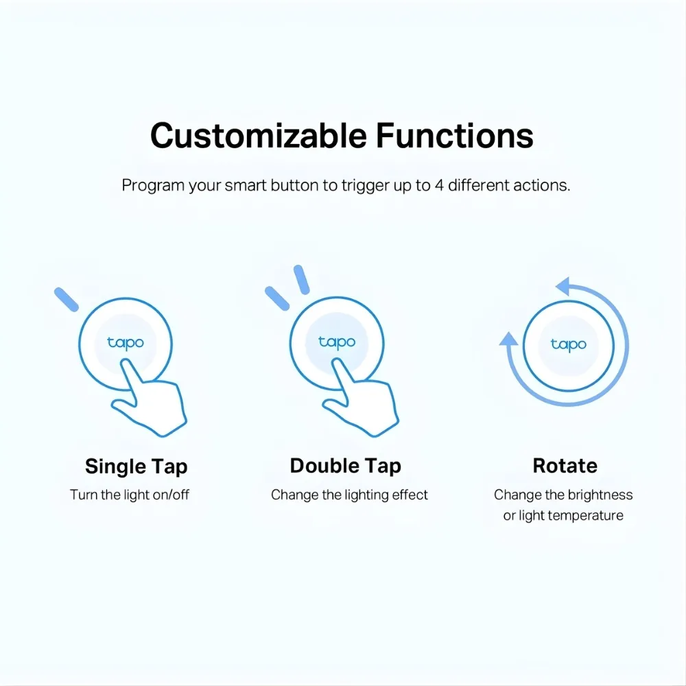 Tapo S200B có thể được lập trình để thực hiện tối đa 4 hành động khác nhau thông qua các thao tác nhấn một lần, nhấn hai lần và xoay, ví dụ như bật/tắt đèn, thay đổi hiệu ứng ánh sáng, hoặc điều chỉnh độ sáng/nhiệt độ màu.
