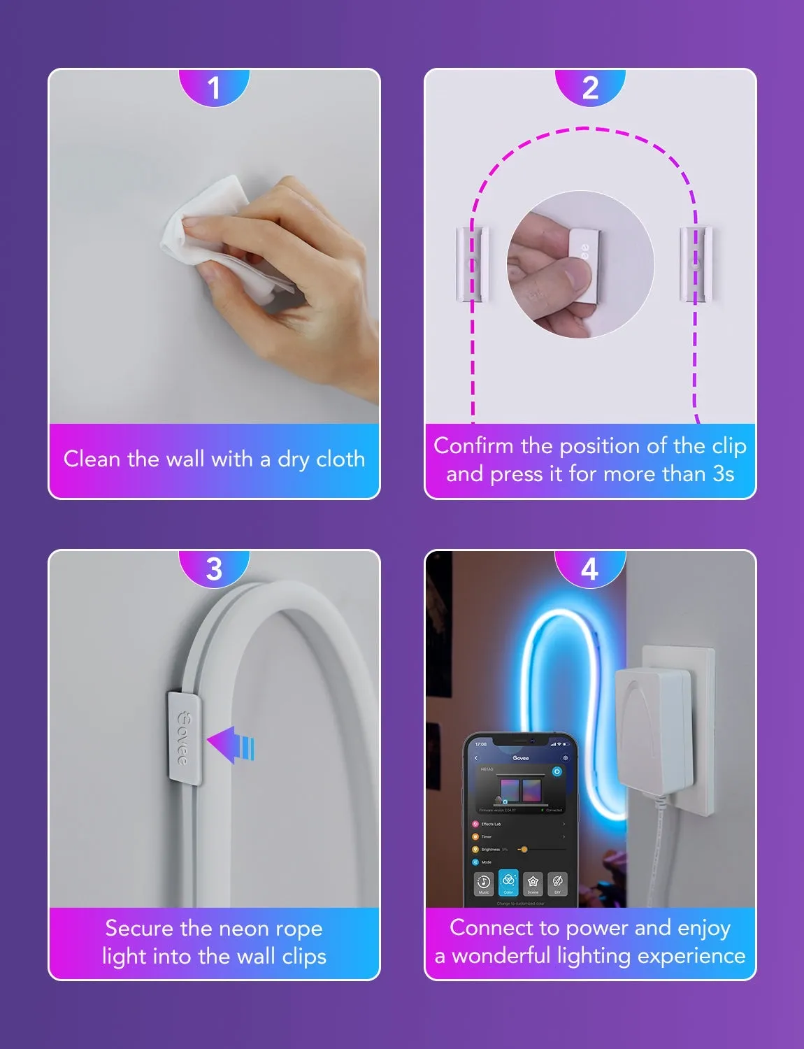 16 triệu tùy chọn màu sắc được cung cấp trên Govee Home APP, bạn có thể dễ dàng lựa chọn màu ưa thích của mình thông qua ứng dụng điều khiển.