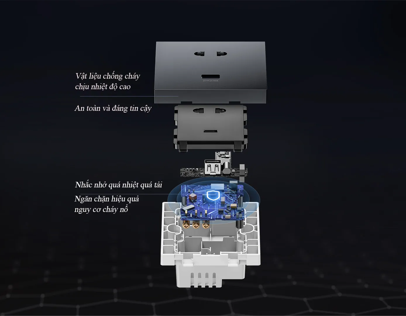 Vỏ của ổ cắm sử dụng chất liệu chống cháy cao cấp, chịu được nhiệt độ cao. Con chip thông minh có khả năng ngắt điện kịp thời khi bị quá tải sẽ giúp ngăn ngừa hiệu quả các nguy cơ về cháy/nổ do chập điện.